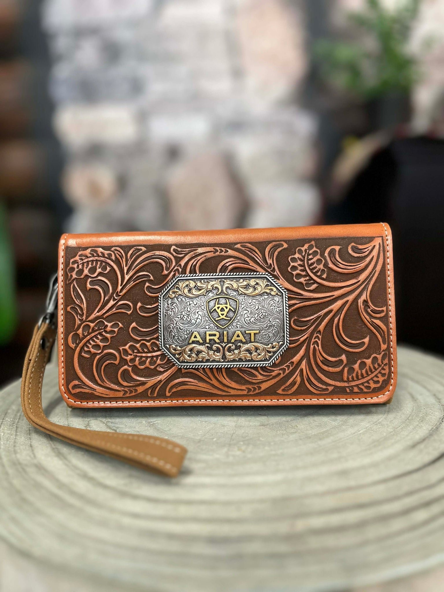 Ariat ladies wallet from the Evelyn collection. Tan man made material body with a roughout feel and tan leather flap with scroll embossing and a multi-finish Ariat buckle concho in the middle of the leather flap with magnetic closure. 1 zip pocket on the back and a removable PU wristlet. Cash and card slots, ID window, checkbook and pen holder for all your necessities.