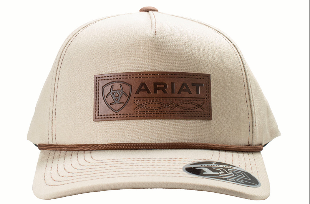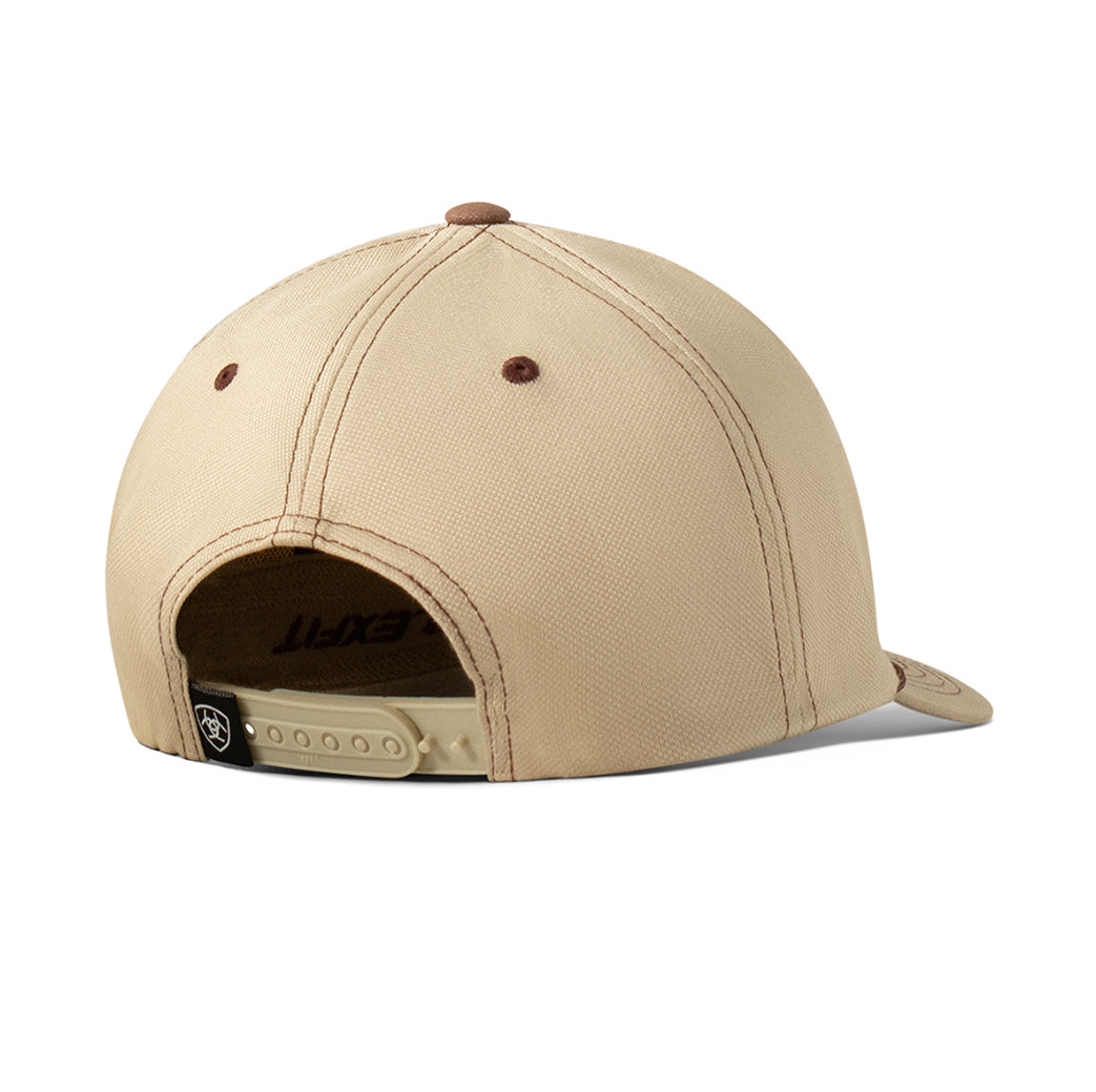 Ariat Men's FlexFit 110 Cap. Khaki fabric on the front panel and the bill with a brown brim rope. Khaki fabric back with a snap back closure for that perfect fit.