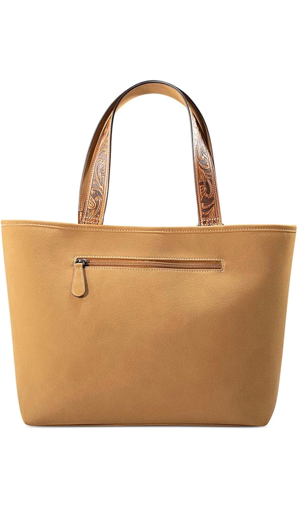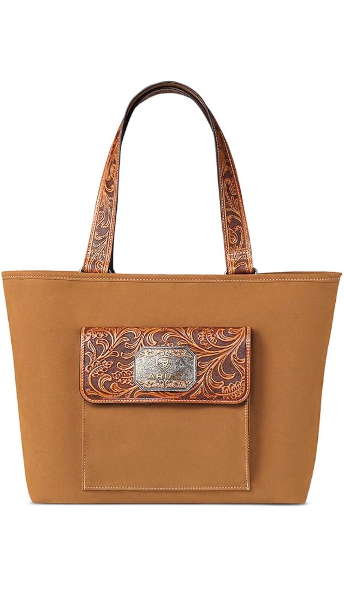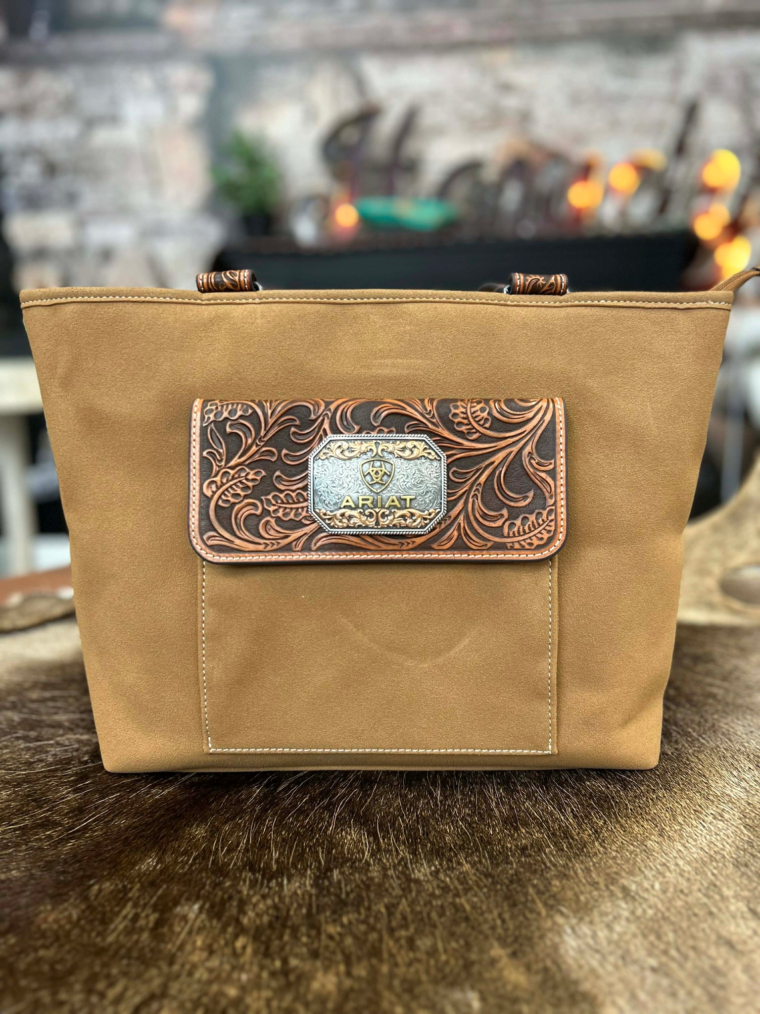 Womens Ariat Handbag: Ariat women’s tote handbag from the Evelyn collection. Tan man made material body with a roughout feel and tan leather handles with scroll embossing. Front pocket with a tan leather flap with scroll embossing and zipper closure. Multi-finish Ariat buckle concho in the middle of the leather flap on the front of tote. Zipper closure with 1 zip pocket on the back and 2 open pockets and 1 zip pocket on the inside. 14 x 11 ½ x 4 ¾. 50% Leather, 50% PU. A770021008