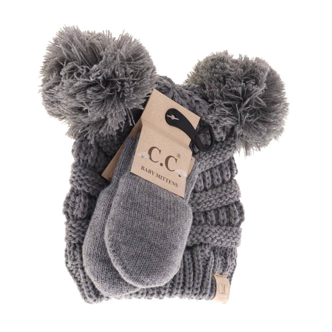 These baby sets are perfect for your newest member of the family! They feature a classic knit C.C baby beanie and knit double poms with matching mittens that are fuzzy lined!