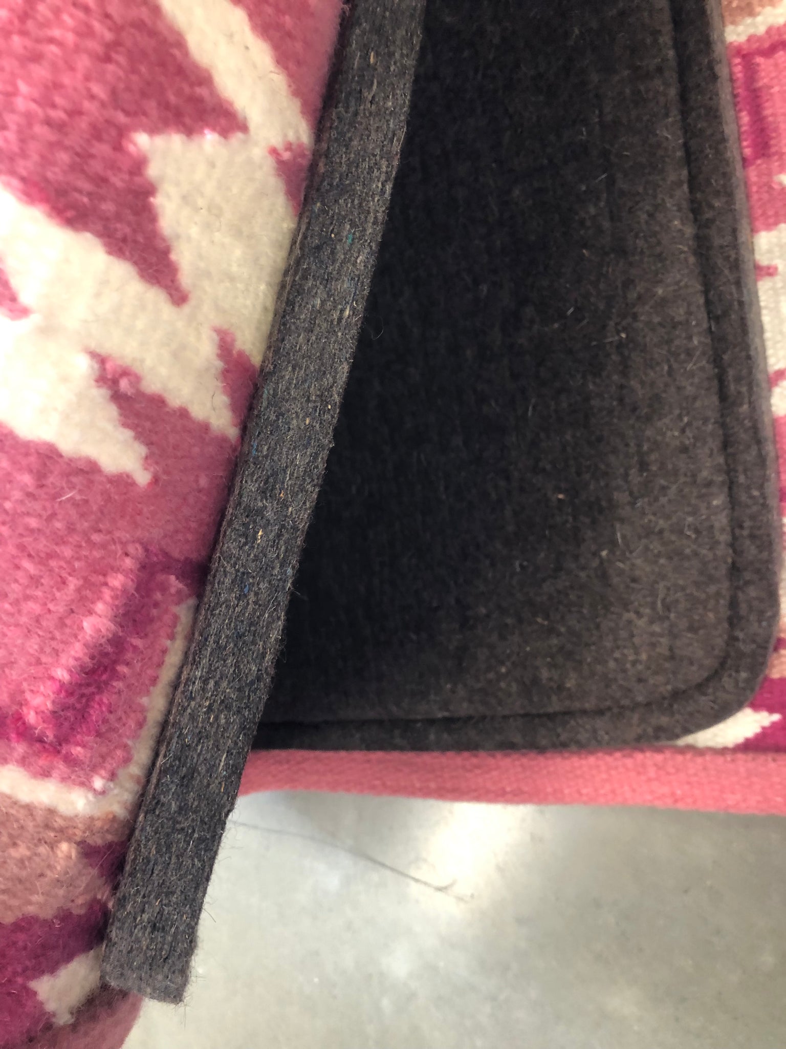 100% 18mm Wool Felt padding covered by 100% wool blanket. Contoured for better fit and genuine leather trim.