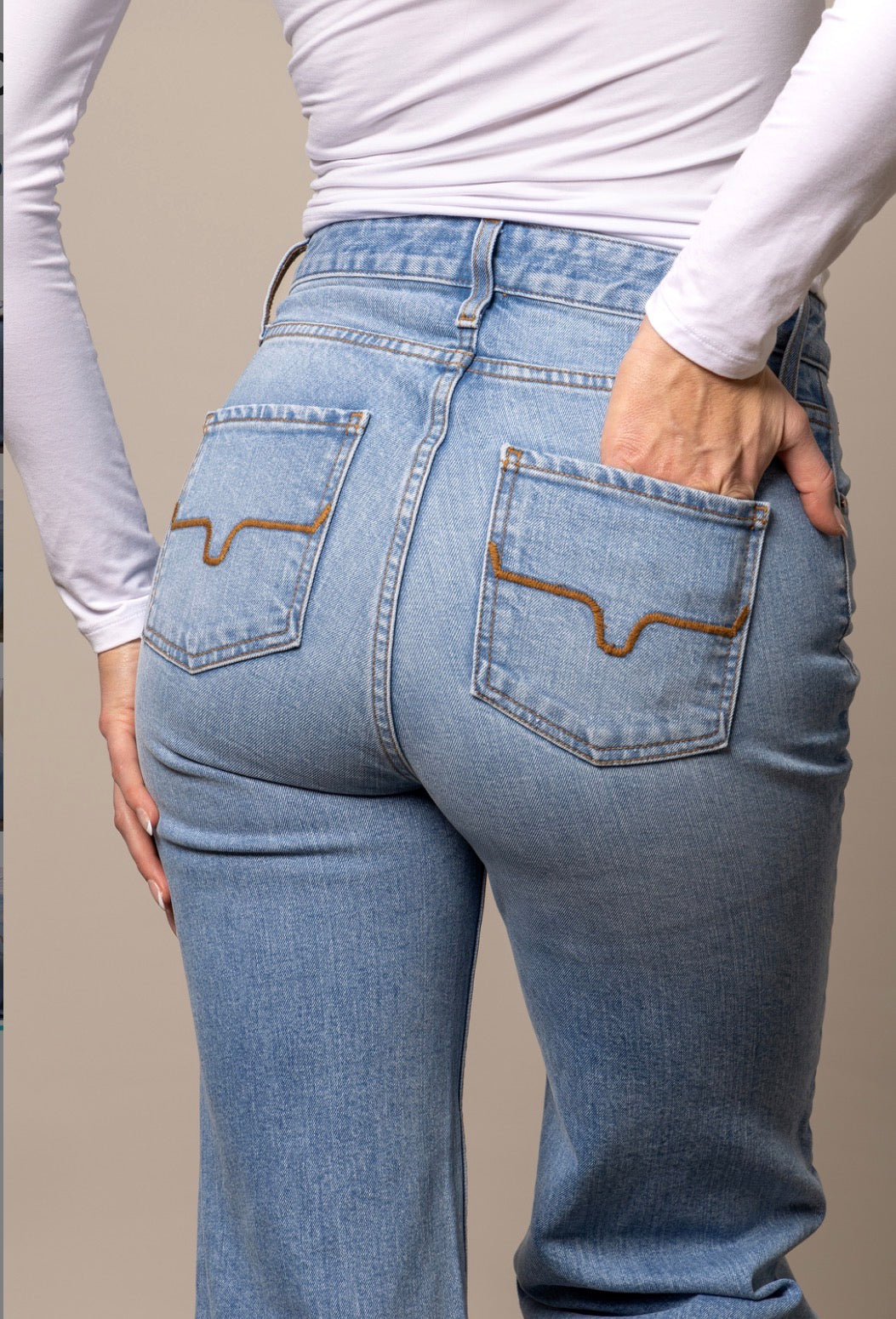 The Women’s Zoey Jeans by Kimes Ranch bring authentic Western style with a modern edge. Designed with a flattering high-rise waist and a wide stovepipe leg, these light wash jeans offer a classic ranch-ready look that pairs perfectly with pearl snap shirts, tucked-in tees, or your favorite boots. Crafted from premium denim with just a touch of stretch, they deliver durability, comfort, and the timeless Western quality Kimes Ranch is known for—whether you’re headed to the rodeo, the ranch, or a night out.