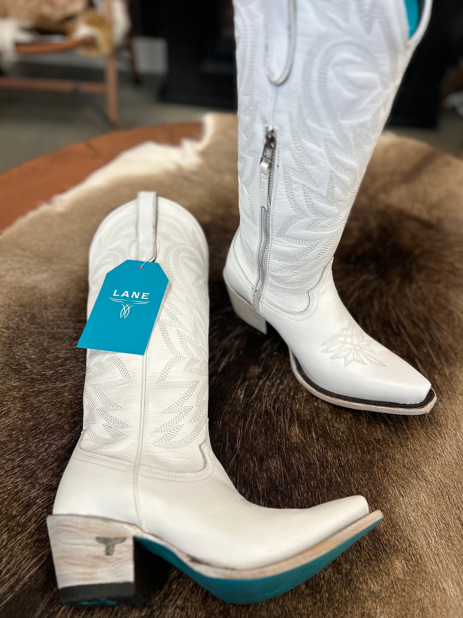 She's a timeless renegade. A matte white cowgirl boot right off the runway. This classic snip toe is accompanied by an abstract cosmic starburst pattern and retro-inspired toe stitch.Level up your wardrobe and pair this blue-bottom hottie with your favorite little black dress.