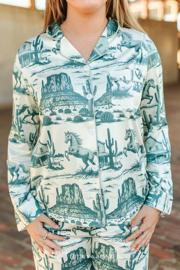 Cream Jade Western Printed Button Down Pants / PJ Set