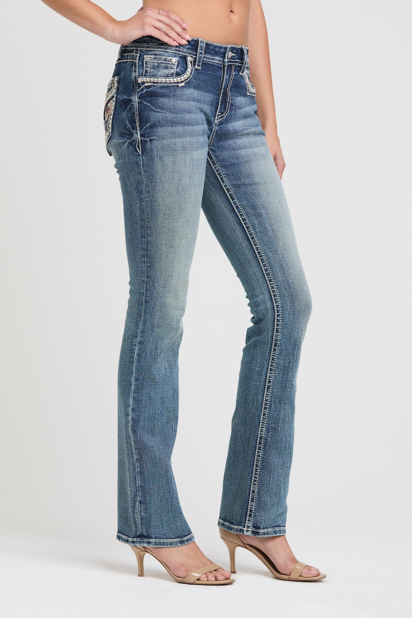 The grace in la women's bootcut jean in easy fit sits right at the waist to create a hip hugger feel on the hips and thighs. The jean is a cross detailed with medium blue wash. They look like they’ve been yours forever, with details like distressing, sanding, and whiskering. So go ahead and make it official—your new bootcut jean is just a click away.