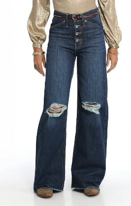 Consumers love the SKYLAR wide leg! So by popular demand, the new SKYLAR wide leg impresses with its trendy button fly and timeless dark stonewash highlighted with sanding, whiskers, tacking, and strategically placed destruction at the knees.