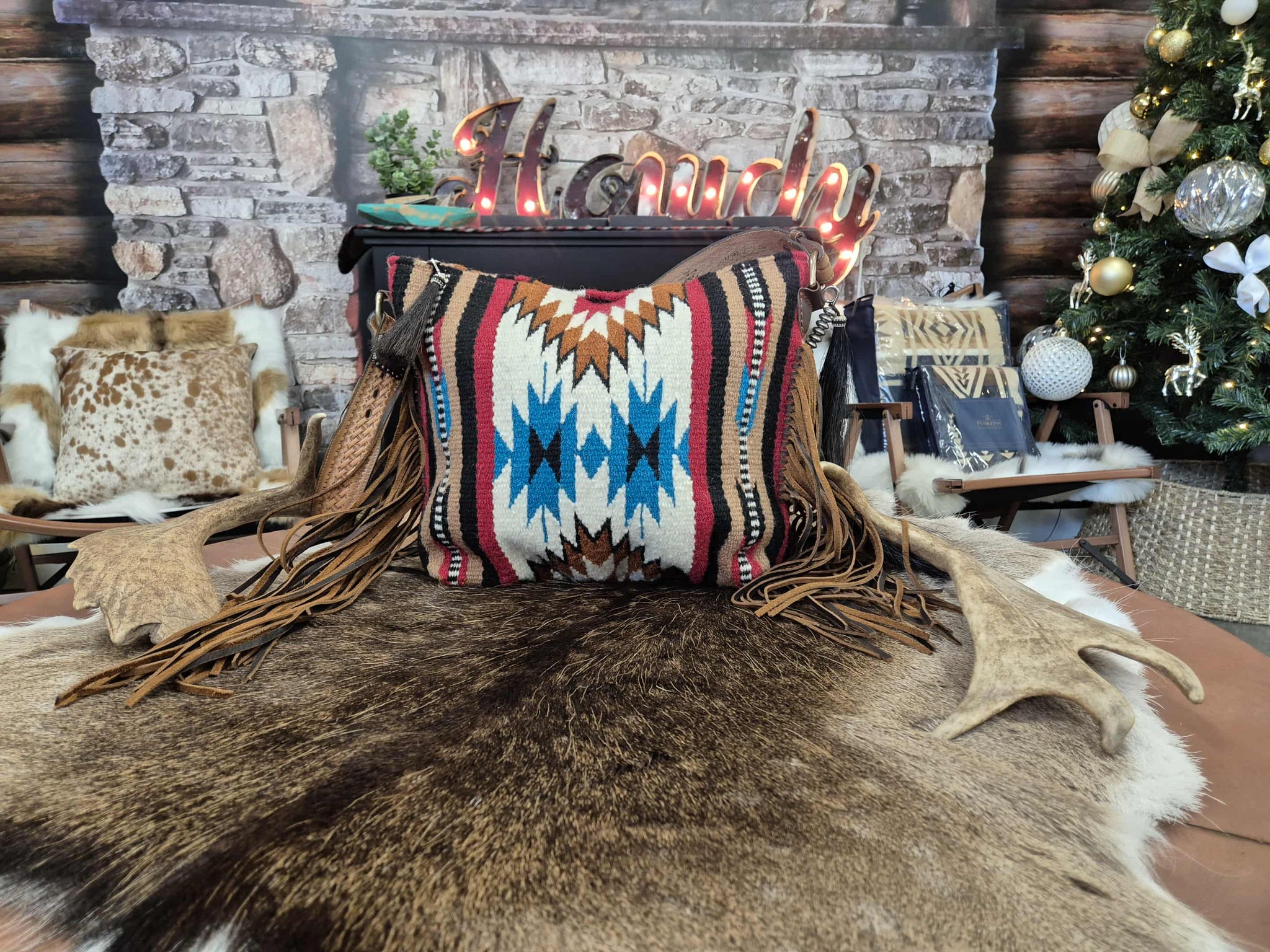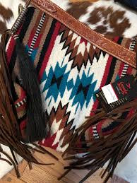 Our Hand Crafted, 100% Wool Desert Sunrise Saddle Blanket Tote is fully lined with two large inside pockets and Zipper closure. Vintage 1970’s belt, Tack Quality D-Rings, Unique Western Concho, Hand Fringed down Both Sides with Cut Latigo Leather Fringe, Antique Laundry Pin, Spirit Beads with 10” horsehair Shoo-fly and Horse Hair Zipper Pull.