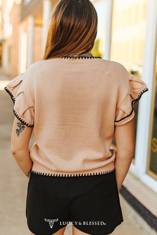 Giddy Up Knit Stitched Ruffle Short Sleeve Sweatshirt Top