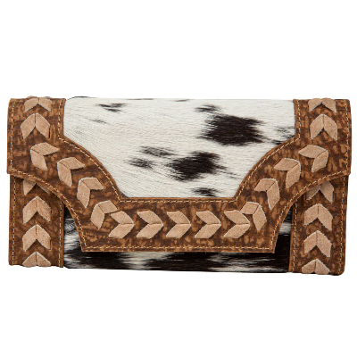 This adorable wallet features hair-on hide with detailed broad stitching on the patterned leather. The hair-on hide continues on the back, while the interior features a zippered pocket and plenty of room for cards, IDs, and other other important items. Snaps closed. Sure to be your favorite accessory!