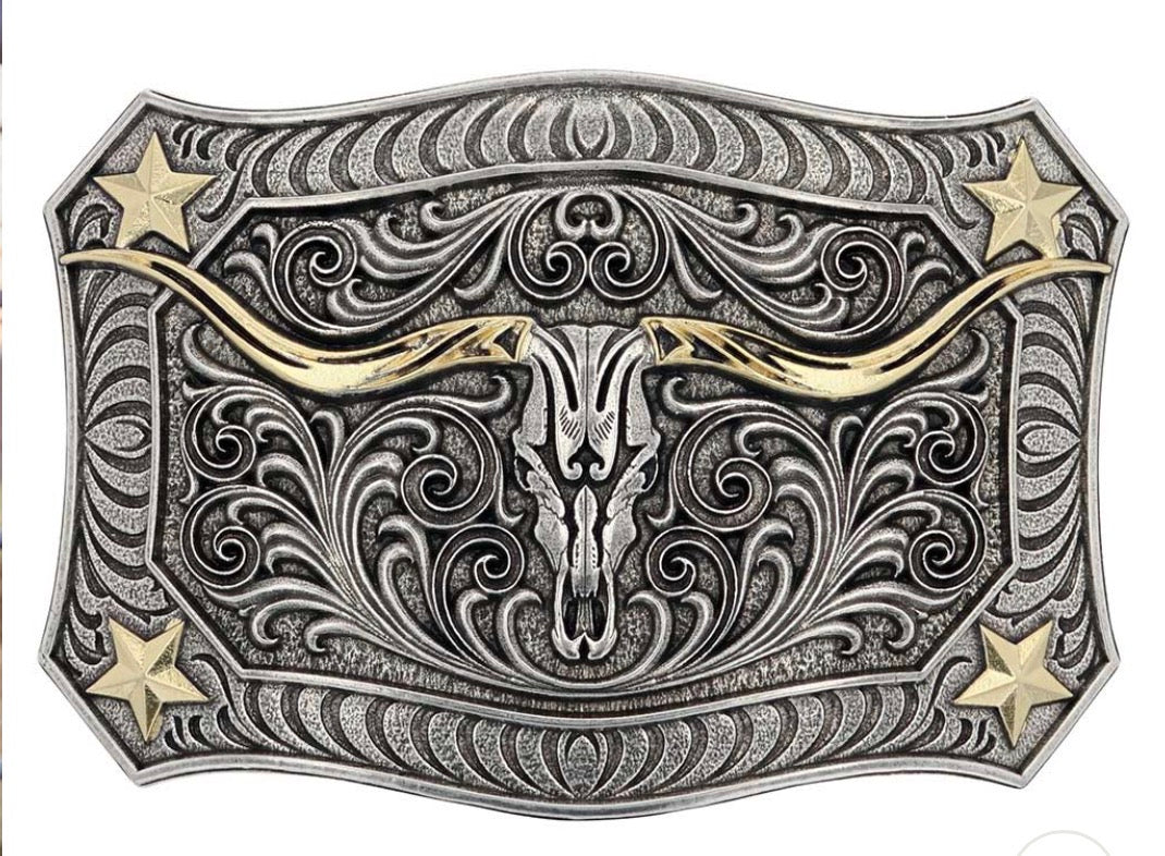 Squared and scalloped in shape in an antique-silver-tone, the Longhorn Crest Filigree Attitude Belt Buckle is free-spirited and has a western ruggedness. It holds a longhorn skull in the center that is cradled by exaggerated filigree. A mix of silver and gold tones give this Attitude buckle added depth and character. Each corner has a star and additional filigree while the buckle is framed in a smooth wire-like trim. Standard 1.5 inch belt swivel.