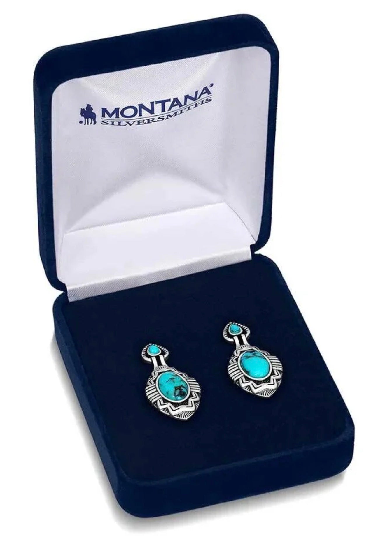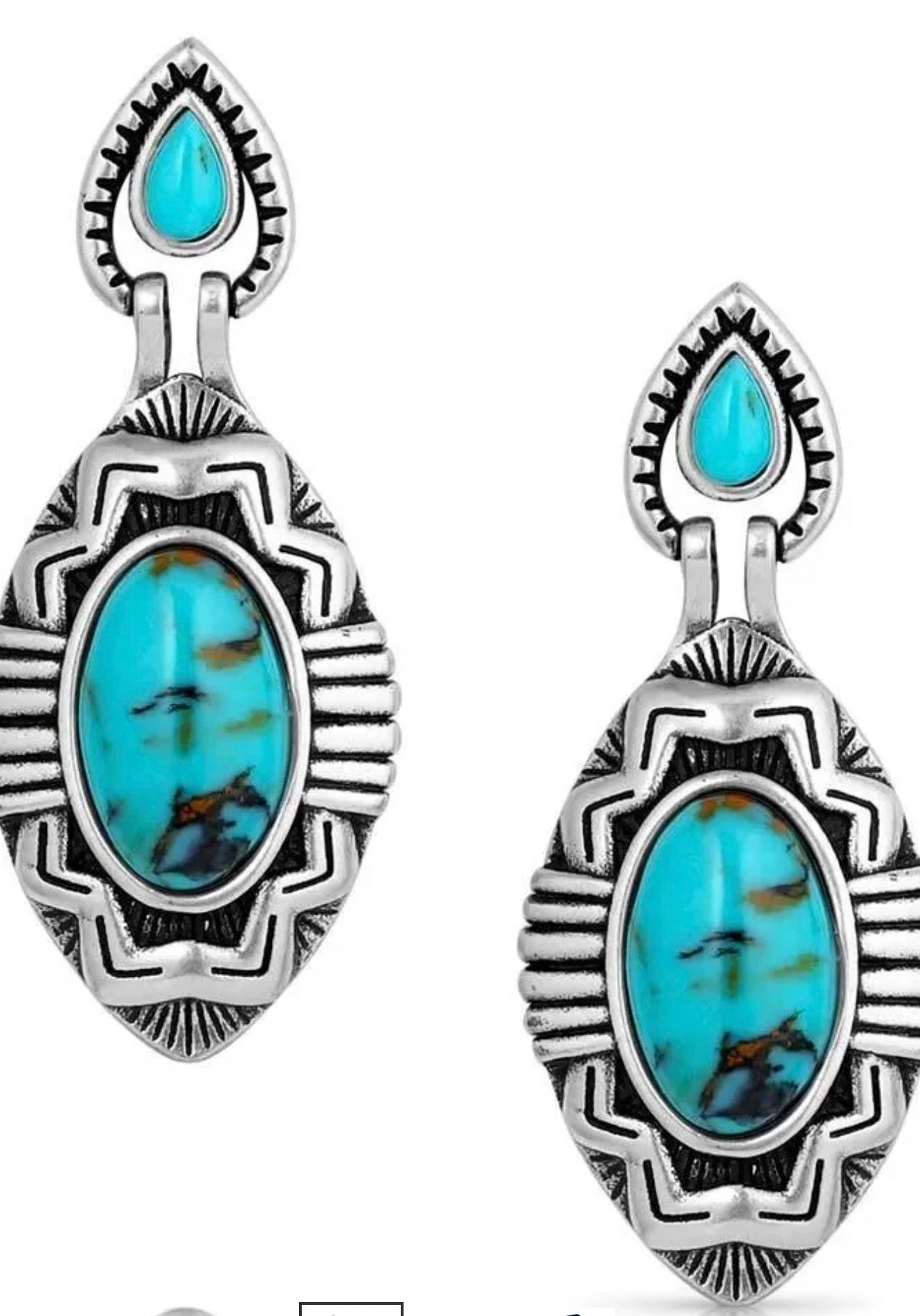 Add a Southwest feel to any look with these showstopping and bold earrings! The Blue Mesa Turquoise Earrings feature a gorgeous Southwest style etching in a beautiful silver tone that frames the center oval turquoise stone. A light antiquing shows the details in the design giving the earrings a more dynamic look. The oval piece hangs below a smaller teardrop shaped turquoise stone framed by open cut silver tone which secures the earrings to a hypoallergenic post back wire. Stone color may vary.