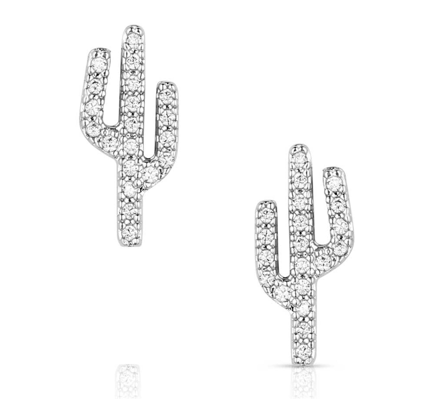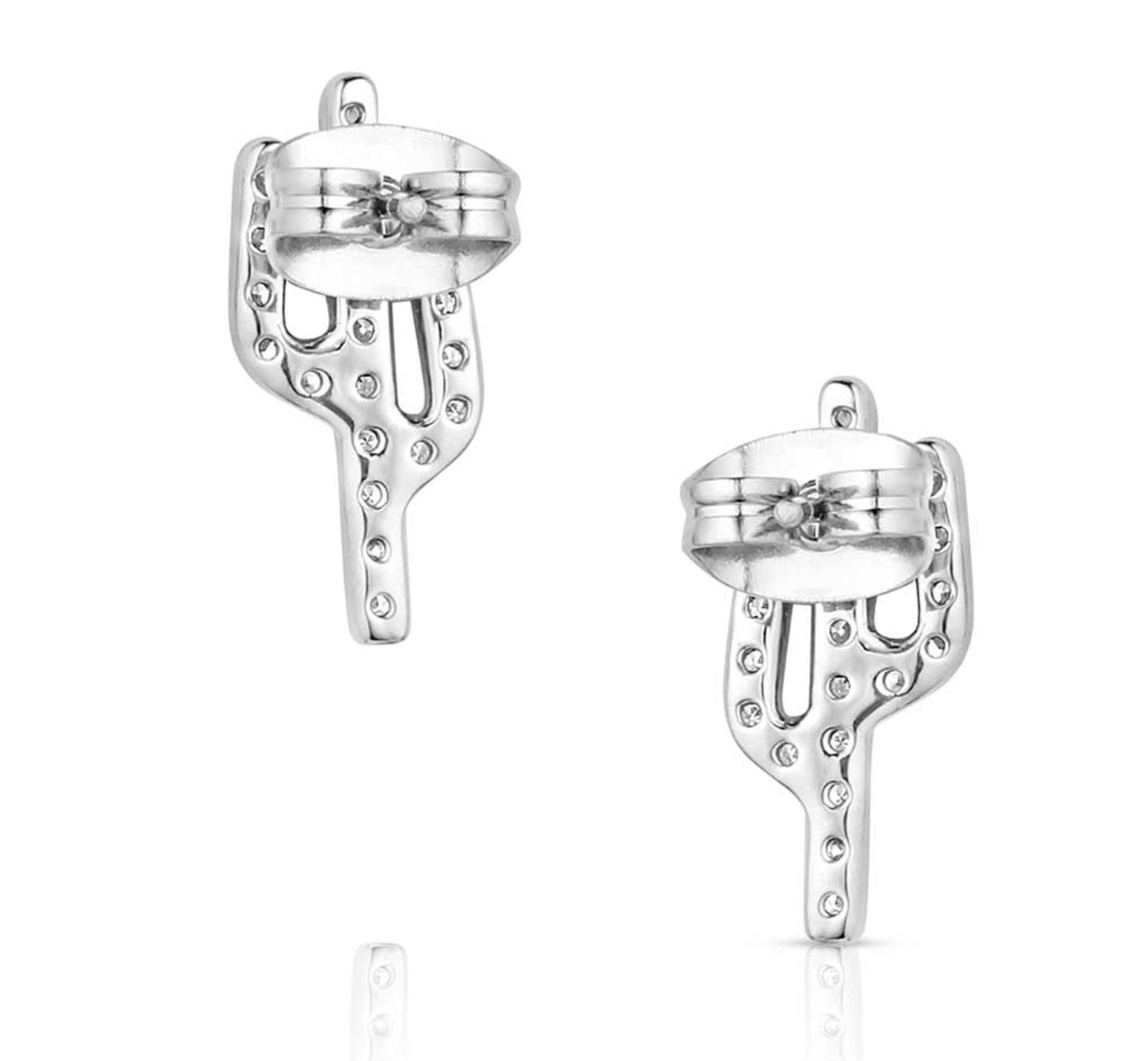 Add some sparkle from the stars to your western flair. Stunning clear cubic zirconia crystals cover these cactus shaped earrings from top to bottom. The earrings are secured by hypoallergenic post back wires. Wear the Sparkling Saguaro Earrings on any occasion for a shimmering look.