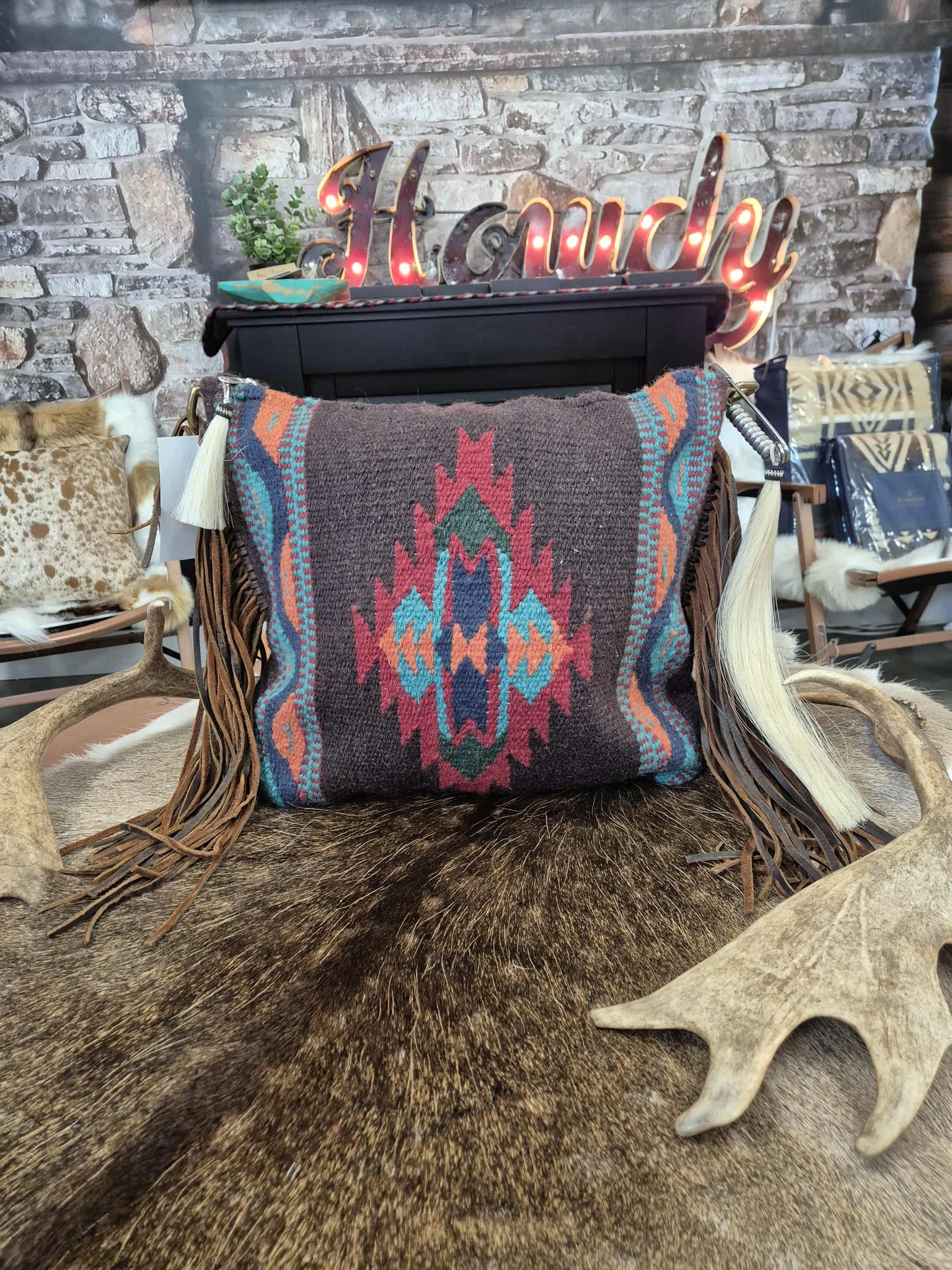 Hand Crafted, 100% Wool Saddle Blanket Tote is fully lined with two large inside pockets and zipper closure. Vintage 1970’s Belt, Tack Quality D-Rings, Unique Western Concho and Belt Strap, Hand Fringed down Both Sides with Cut Latigo Leather Fringe, Antique Laundry Pin, Spirit Beads and 10” Horsehair Shoo-fly tassel,Horse Hair Zipper Pull.