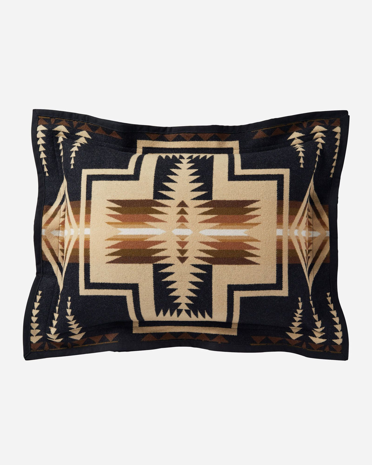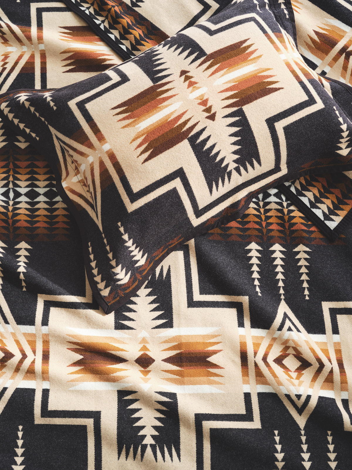 A wool pillow sham made in America with a story dating back nearly a century. In 1923, President Warren Harding and his wife came west to dedicate a portion of the old Oregon Trail. At the ceremony, local Cayuse and Umatilla chiefs presented the first lady with a Pendleton shawl inspired by Pendleton's famous Chief Joseph blanket. This dynamic design was an instant hit and remains in production today, still woven in the Northwest mills.