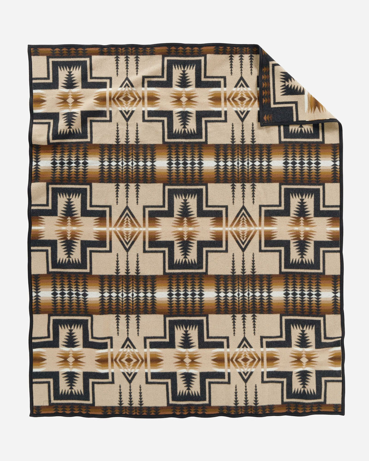 One of the most popular Pendleton designs ever, the Harding Blanket is crafted of USA-made wool in the Oregon mill. In 1923, President Warren Harding and his wife Florence came west to dedicate a portion of the Old Oregon Trail. At the ceremony, local chiefs presented the first lady with a Pendleton shawl inspired by their famous Chief Joseph blanket. This dynamic design was an instant hit and remains in production today.