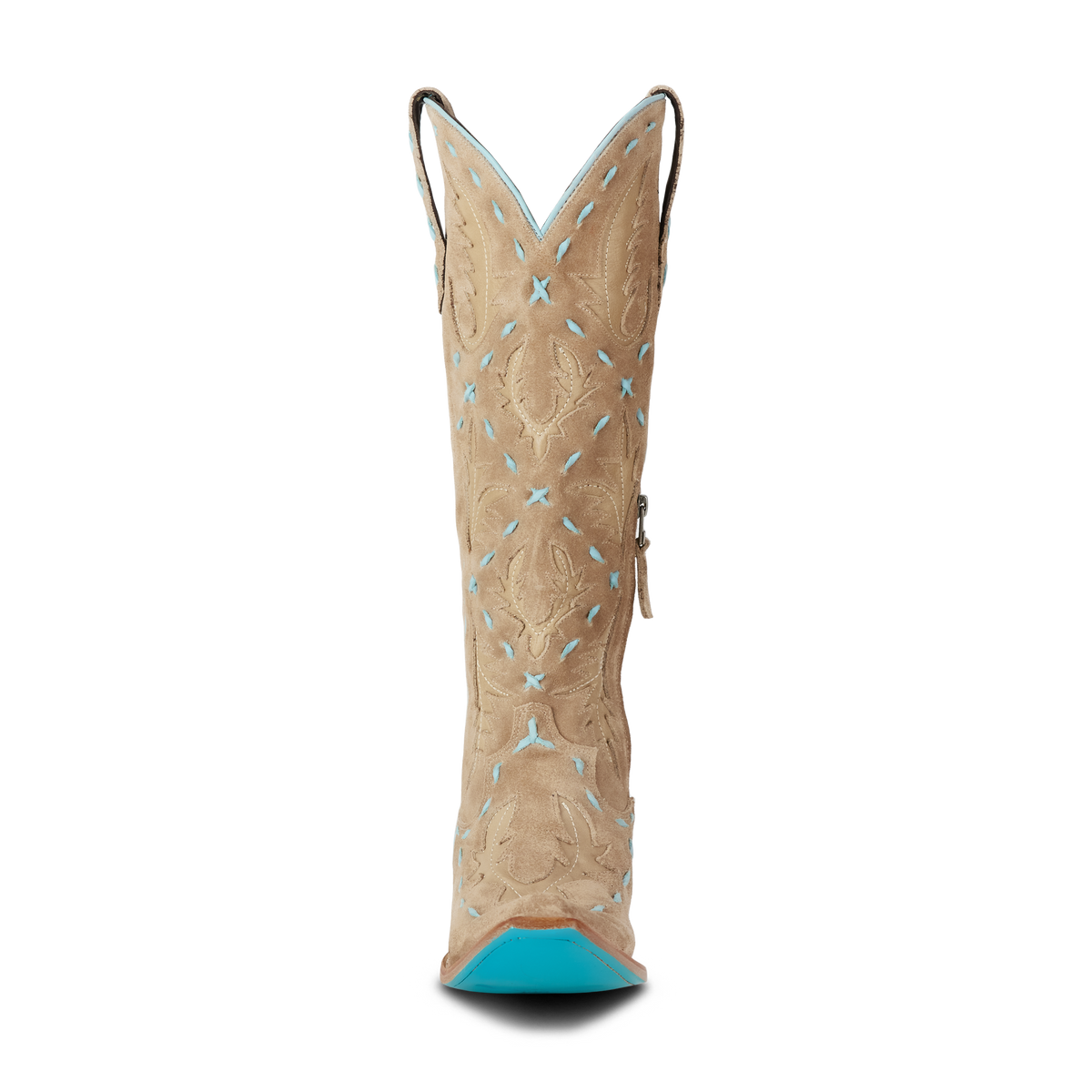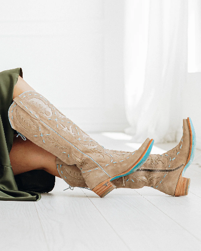 This collaboration features the signature latte suede and powder blue accents you’ve come to love from West Desperado. The Reverie features a functional corset with wide tongue to accommodate all sexy leg types. Customize the corset to your leg one time and the easy in, easy out zipper will take care of the rest.
