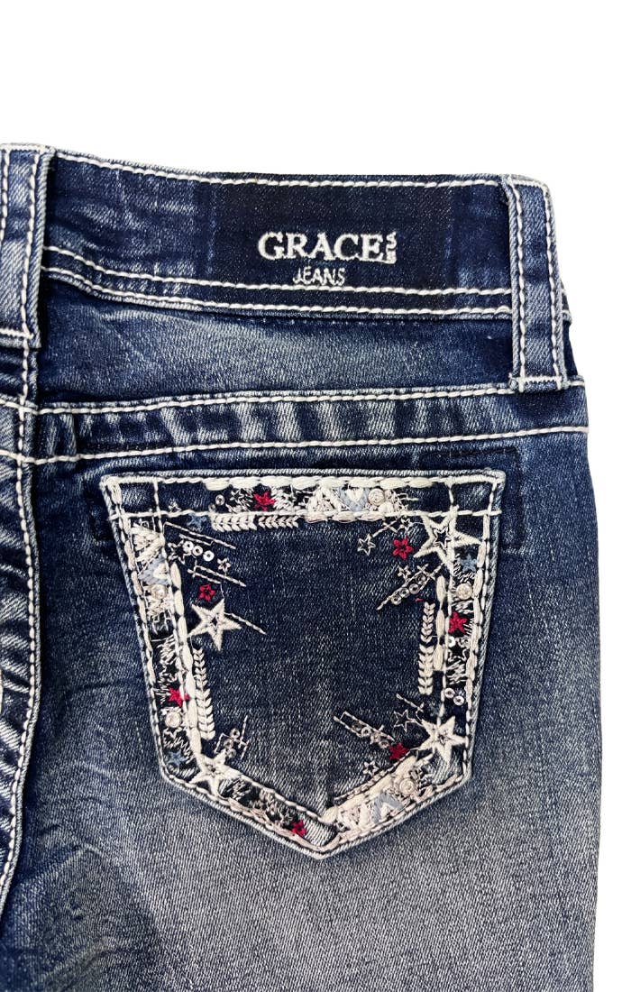 The Grace in LA girls and little girls' jeans come in different fits, we have bootcut, skinny, flare. The jeans are unique detailed with embroidery, western stich, and accent sequins. All natural washes with natural hand sanding and whickering. These jeans make every girl and little girl feel special and comfortable.