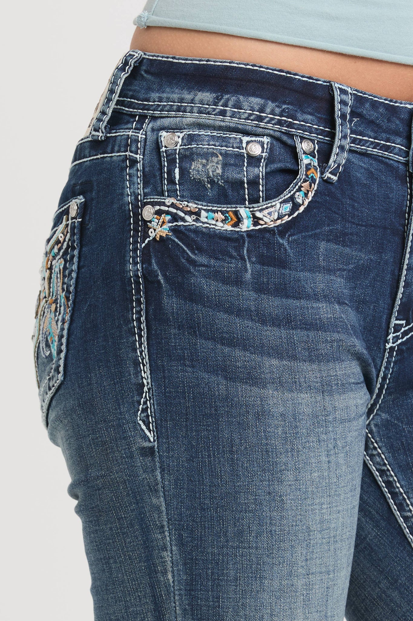 The grace in la women's bootcut jean in easy fit sits right at the waist to create a hip hugger feel on the hips and thighs. The jean is a horse hide detailed with steer head embroidery in medium blue wash. They look like they’ve been yours forever, with details like distressing, sanding, and whiskering. So go ahead and make it official—your new bootcut jean is just a click away.