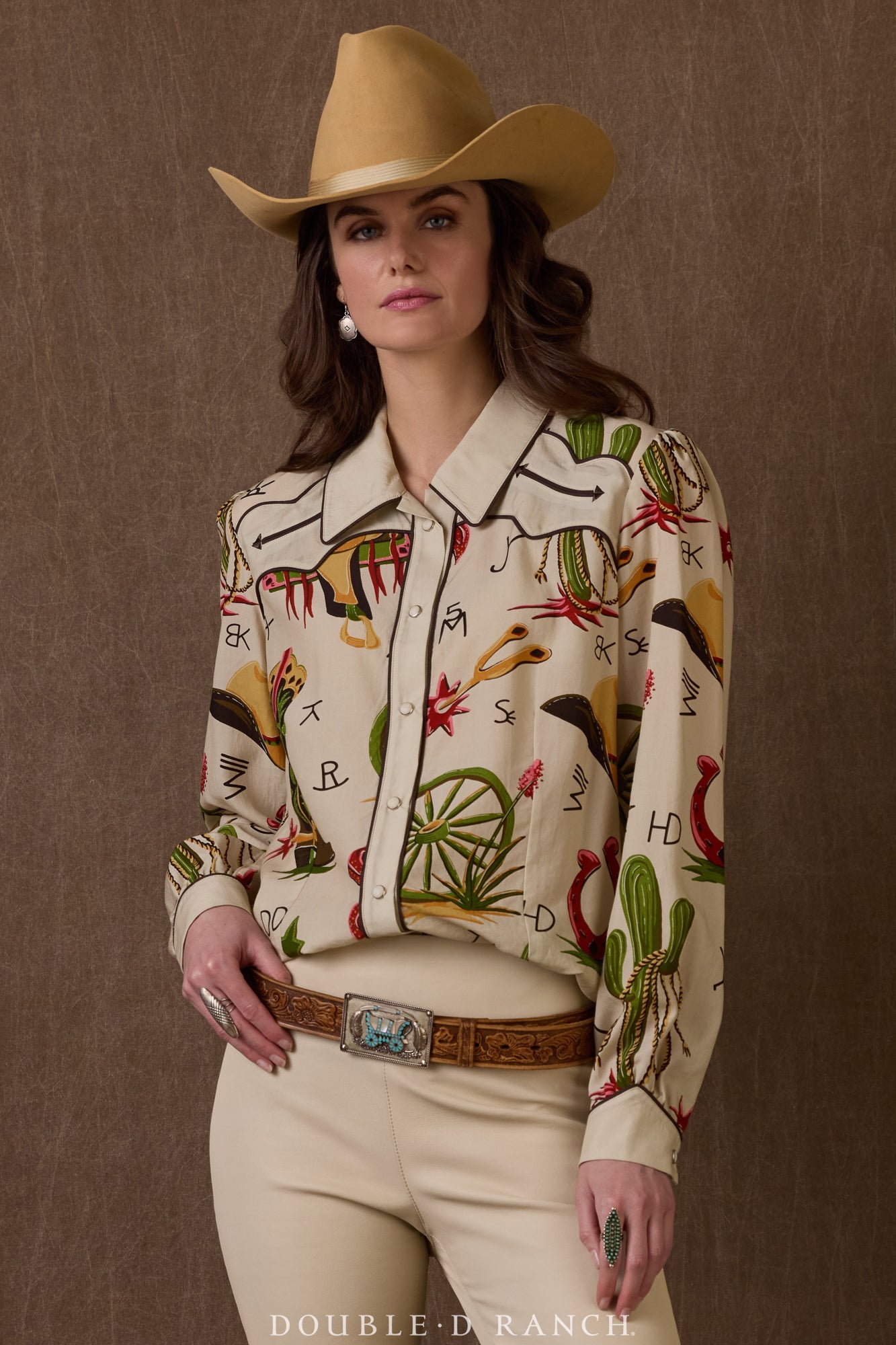The pearl snap is a quintessential cowgirl classic, and we have reinvented it with next level charm and twang! It’s adorned with this season’s signature print that’s reminiscent of retro Western wallpaper, and the unique yoke and contrasting trim give it a twangy feminine flair. It’s darling with denim and super-chic paired with the bone colored “butter booty” Bandit Pant if you’ve got’em!