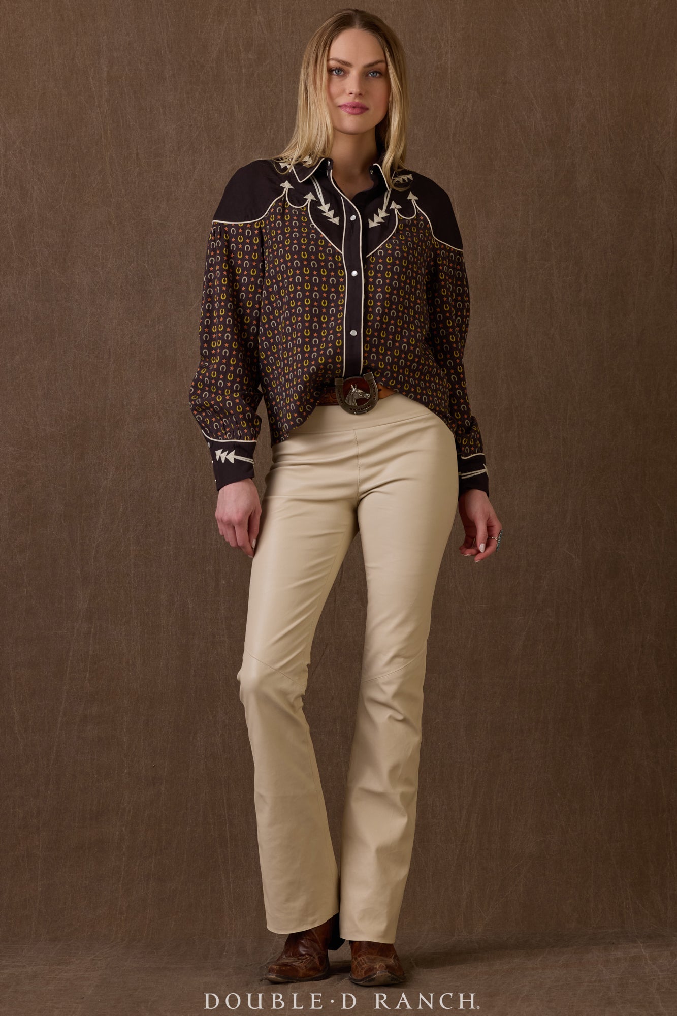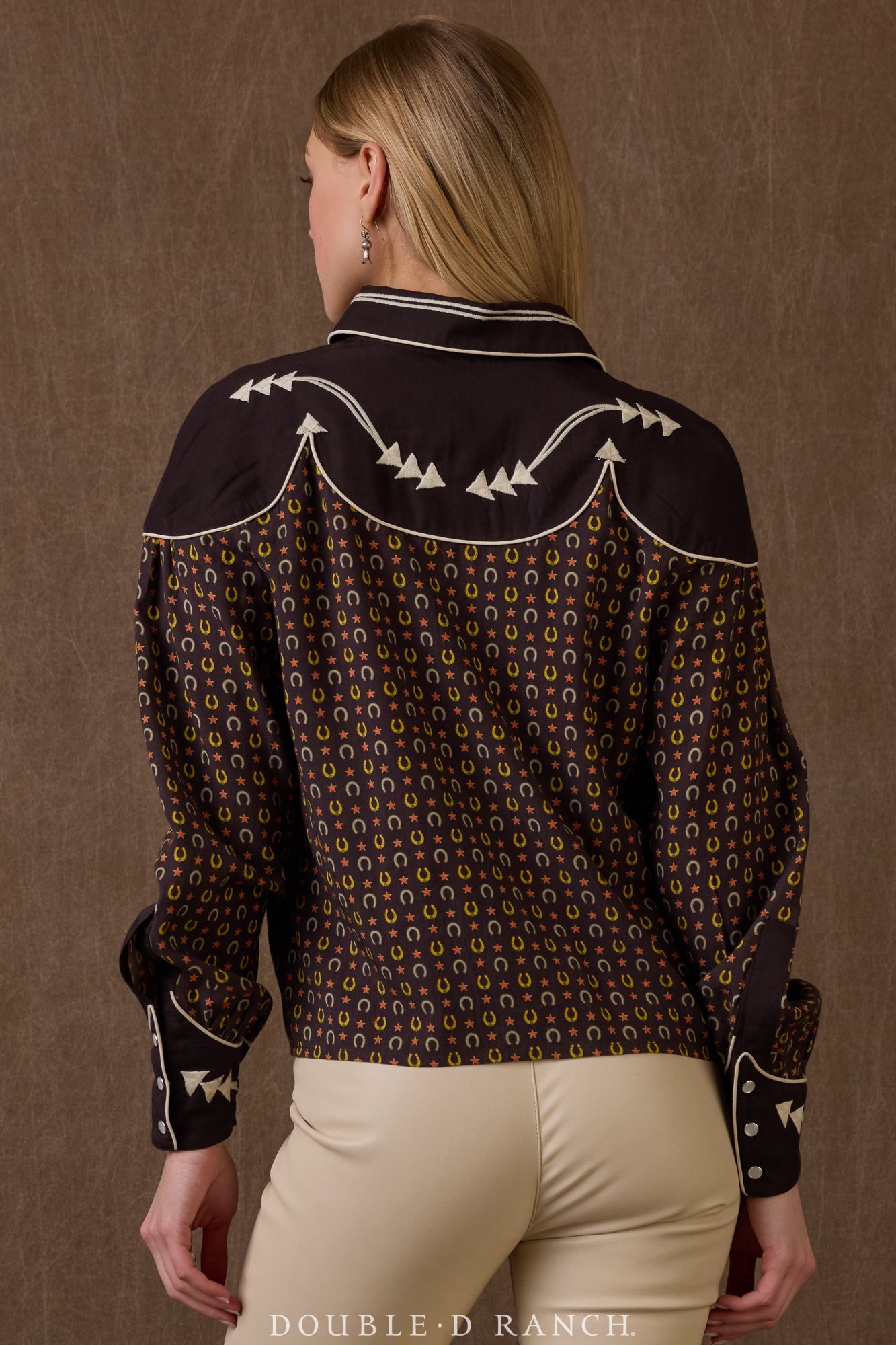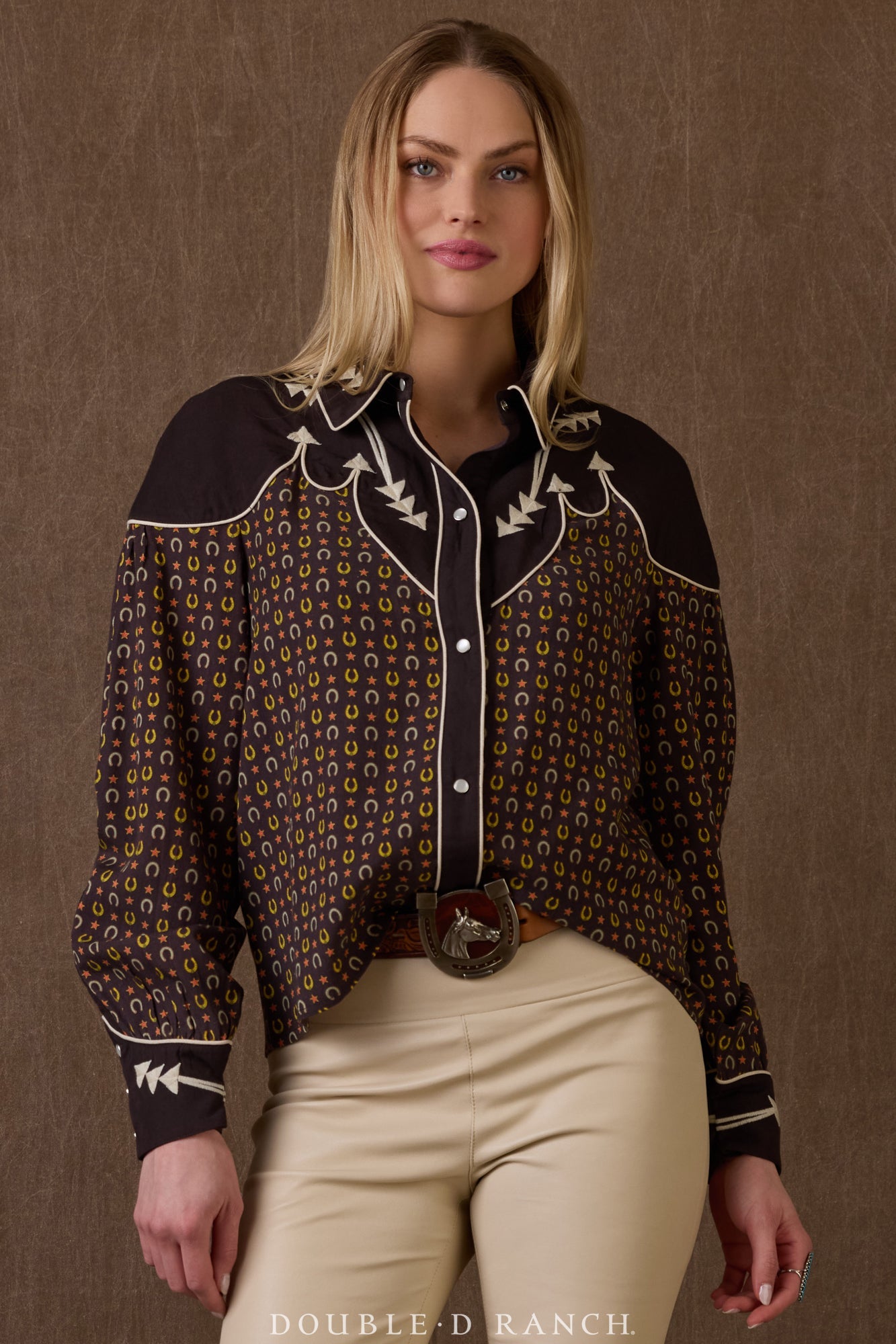 Y’all know how much we love a horseshoe, so this charming little print stole our hearts right out of the gate, and it’s perfectly complemented by the contrasting cuffs and yoke. A slight spin on your traditional pearl snap silhouette, this darling top has the traditional button-down vibe with a fresher, more relaxed fit.