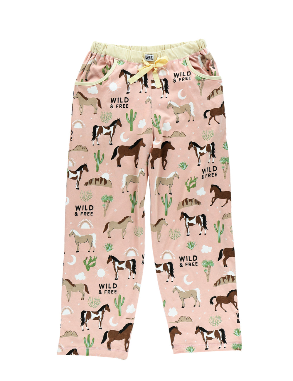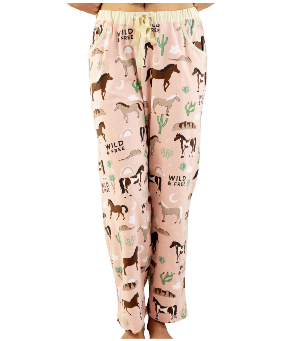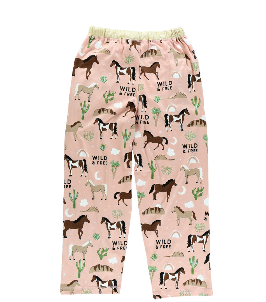 Don't get caught up in tight and uncomfortable pajamas when you could be comfortable and free in our Wild & Free women's pajama pants. These pajama pants feature a cute Horse and desert design on a pink pajama pant. Our Pajama pants are made from breathable 100% combed cotton and have two roomy side pockets and a drawstring waist. Matching tee can be purchased separately.