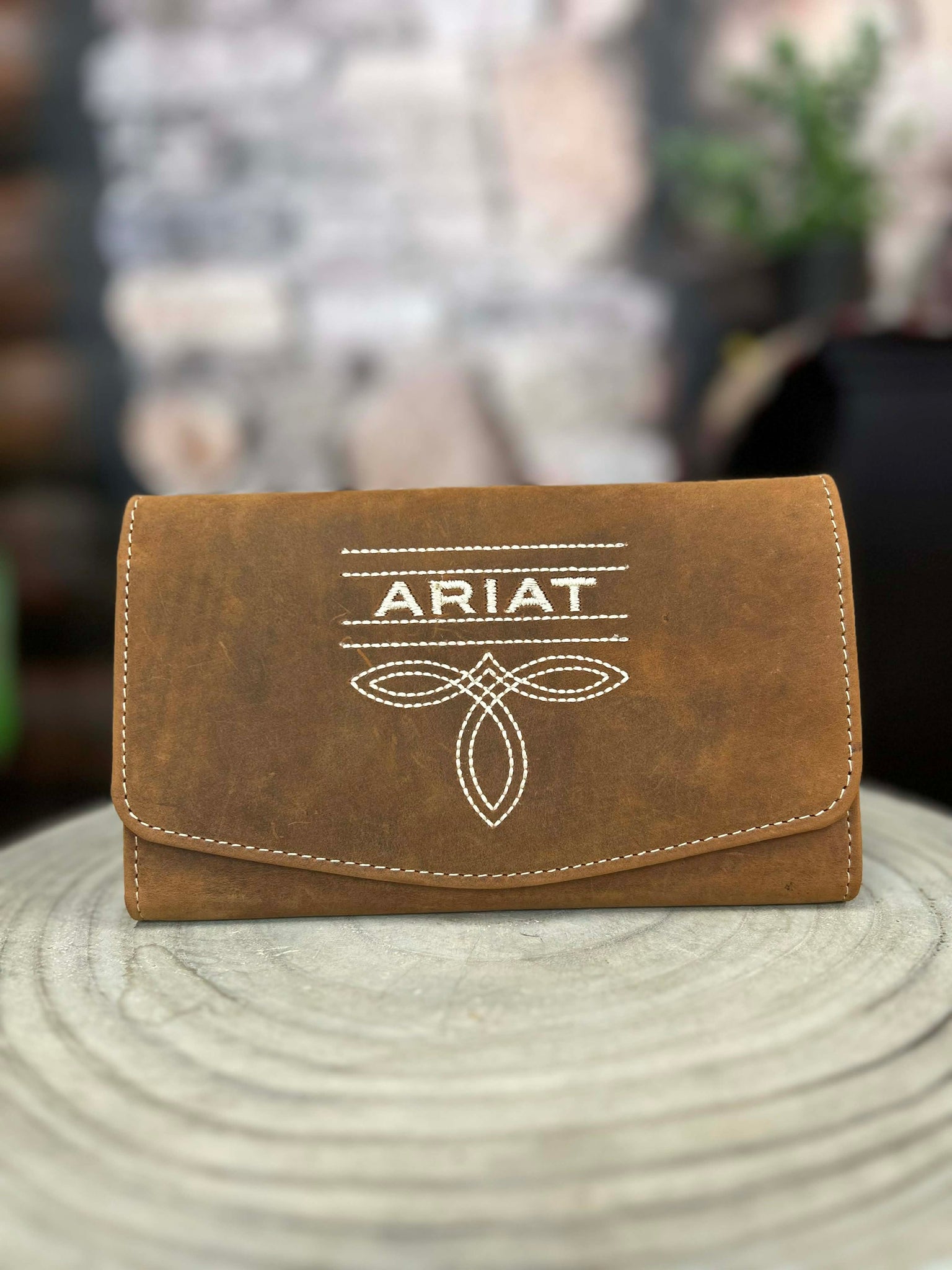 Ariat ladies wallet from the Lynn collection. Aged bark leather bag with Ariat boot stitching in the center. Multiple card and cash slots, ID window, checkbook and pen holder. Magnetic flap closure.