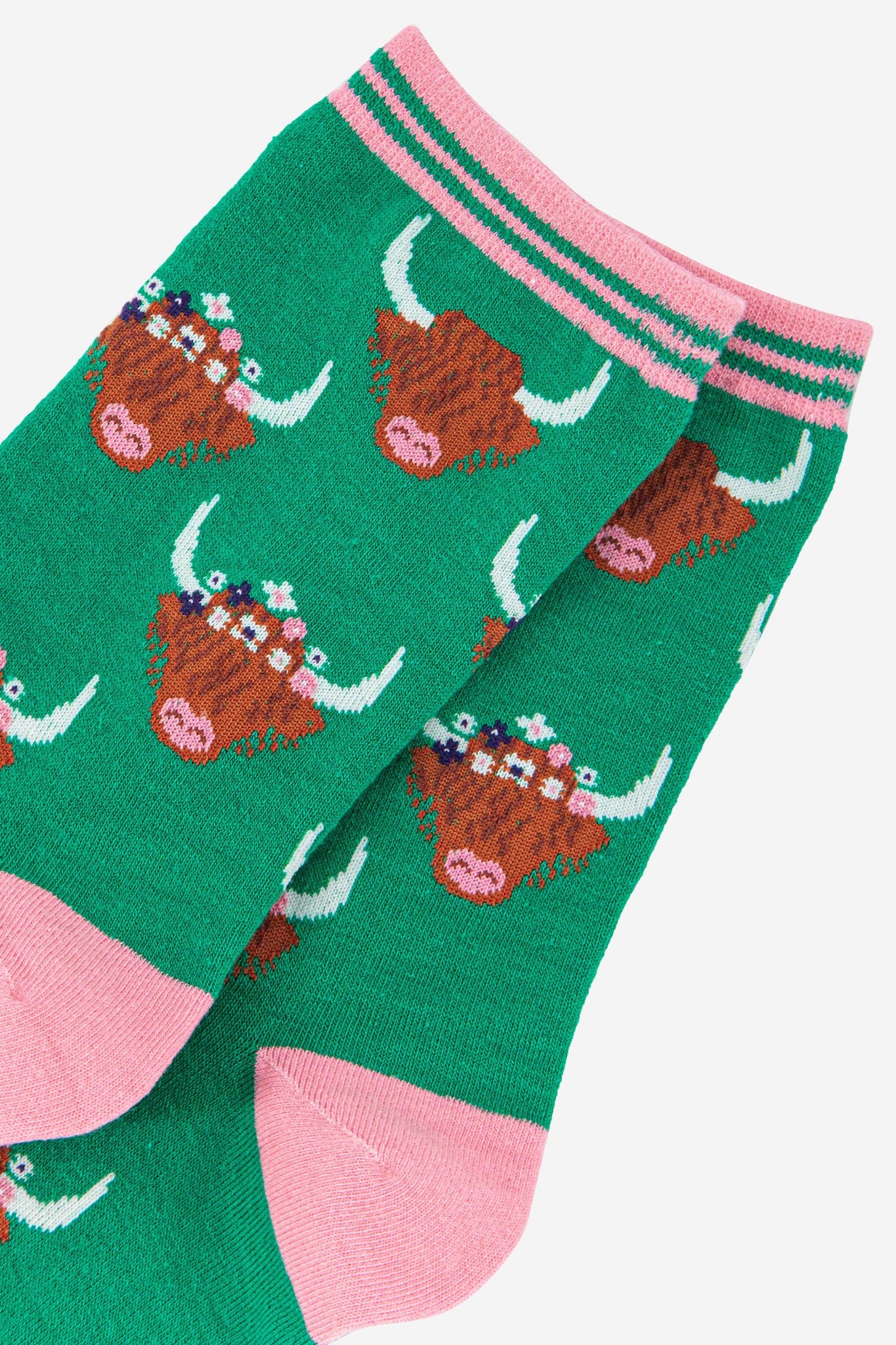 Women's Scottish themed bamboo socks featuring highland cows wearing a floral crown. Design finished with a striped detail cuff.