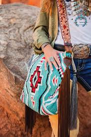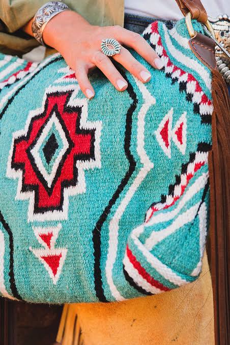 Our Hand Crafted, 100% Wool Desert Sunrise Saddle Blanket Tote is fully lined with two large inside pockets and Zipper closure. Vintage 1970’s belt, Tack Quality D-Rings, Unique Western Concho, Hand Fringed down Both Sides with Cut Latigo Leather Fringe, Antique Laundry Pin, Spirit Beads with 10” horsehair Shoo-fly and Horse Hair Zipper Pull.